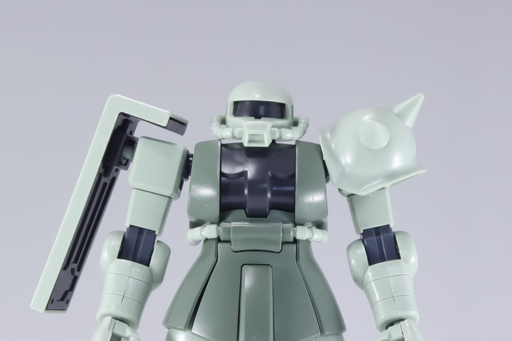 ■ザク特有のプロポーションや機体各部のディテールの再現、足首等のフレキシブルな可動に加え、肩関節のせり出し機構により、ザク・マシンガンやザク・バズーカ等の武器を両手でかまえる事が可能。モノアイは可動式。
